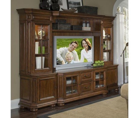With a traditional appeal and superb craftsmanship the Cantata Entertainment Wall System adds style and comfort to your entertainment possibilities. Constructed of Poplar hardwood solids and Cherry and Birch veneers and features a Burnished Cherry finish. CONSOLE FEATURES Two doors each feature a glass insert behind a decorative cross-mullion overlay and each encloses one center adjustable shelf and one fixed bottom shelf.One center top drawer features dovetail joinery construction is mounted on ball-bearing extension guides and has a dust panel. One center bottom drawer is mounted on ball-bearing extension guides and is constructed with dovetail joinery. Center bottom drawer also features a game controller storage box mounted on the back of the drop-front face with wiring access in the back. Removable top and base molding on the ends of the cabinet enable console to function between piers or as a stand-alone unit. With top and base moldings attached the overall length is 65 1/8. Wire access/ventilation slots in back panel behind each outside door. Base levelers and tip restraining hardware included. BRIDGE/ BACK PANEL FEATURES One adjustable upper shelf & one fixed top panel/bridge to be used between piers plus a back panel with wiring access holes.PIER BASE FEATURES Door opens to reveal one adjustable center shelf and one fixed bottom shelf. Wiring access hole in back panel. Base levelers and tip restraining hardware included.PIER DECK FEATURESDoor features a glass insert behind a decorative double-cross mullion overlay. Door encloses two polished-edge adjustable center glass shelves and one fixed bottom veneer shelf. One accent light mounted on underside of top panel features a touch switch on the door hinge. Wiring access hole in back panel and tip restraining hardware included.Console Dimensions 65 1/8 W x 23 1/8 D x 27 H. Bridge/Panel Dimensions 68 1/8 W x 19 D x 48 1/4 H. Pier Base Dimensions 24 1/8 W x 19 3/8 D x 27 H. Pier Deck Dim