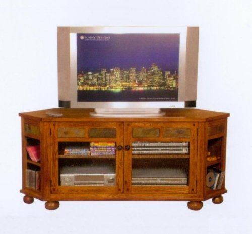 Add bold accent to your dcor with our Sedona collection corner TV console. This piece features a variegated slate inlay border with distressed rustic brown oak finish solids and veneers over the smooth display surface. Below the console are storage shelves behind waterfall glass, and variegated slate inlay accent doors. Great for storage and display, this Sedona TV console would be a bold addition to the distinguished dcor. Width64 Depth27 Height28