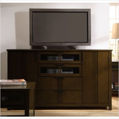 The Brentwood collection was inspired by the design of Frank Lloyd Wright. The vertical slat detail and paneled drawer fronts are reminiscent of Craftsman-style design. The combination of intricate wood work and simple architectural forms create a beautiful and distinctive look for any home. Manufactured using U.S. kiln-dried hardwoods and quartersawn Cherry veneer. Features: -Plasma TV console. -Rich walnut color with a multi-step lacquer and sealer finish. -U.S. alder, kiln-dried hardwoods and cherry veneer construction. -Handcrafted. -Commercial grade frame construction using a combination of double dowel joinery and screwed corner blocks. -Flip up wire access panel . -Rear mounted six outlet power strip. -Steel full-extension drawer glides and a uniform frame construction. -Components shelves with flip down glass panels. -Increased viewing height of 36". -Each side compartments has two adjustable shelves. -Rear access panel, wire management, and plenty of component and media storage. -Contemporary black tab pulls. -Brentwood collection. -Perfect for the bedroom or family room. -Heirloom quality construction ensures a timeless piece including refinements. -Inspired by the American craftsman era. -Creates a comfortable home setting with its clean vertical lines. -Ships fully assembled. Specifications: -Components Shelf Dimensions: 6.75" H x 26.5" W x 21" D. -Side Compartment Dimensions: 31" H x 16" W x 21" D. -Overall Dimensions: 36" H x 63.5" W x 23" D.