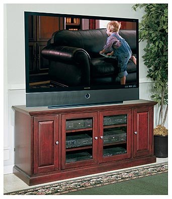 Designed for quality and beauty as well as function, the Northampton 61" console is made with Birch solids and Cherry veneers enhanced by a beautiful cherry finish and accented by decorative hardware in a hammered pewter finish. With it's 30" height, Northampton is perfect for flat panels up to from 42" to (up to) 60" diagonal screen size. All-media storage pullouts provide storage for up to 80 DVD's or 120 CD's. Passive ventilation, wide cable wiring ports and a surge protected power strip add to the functionality